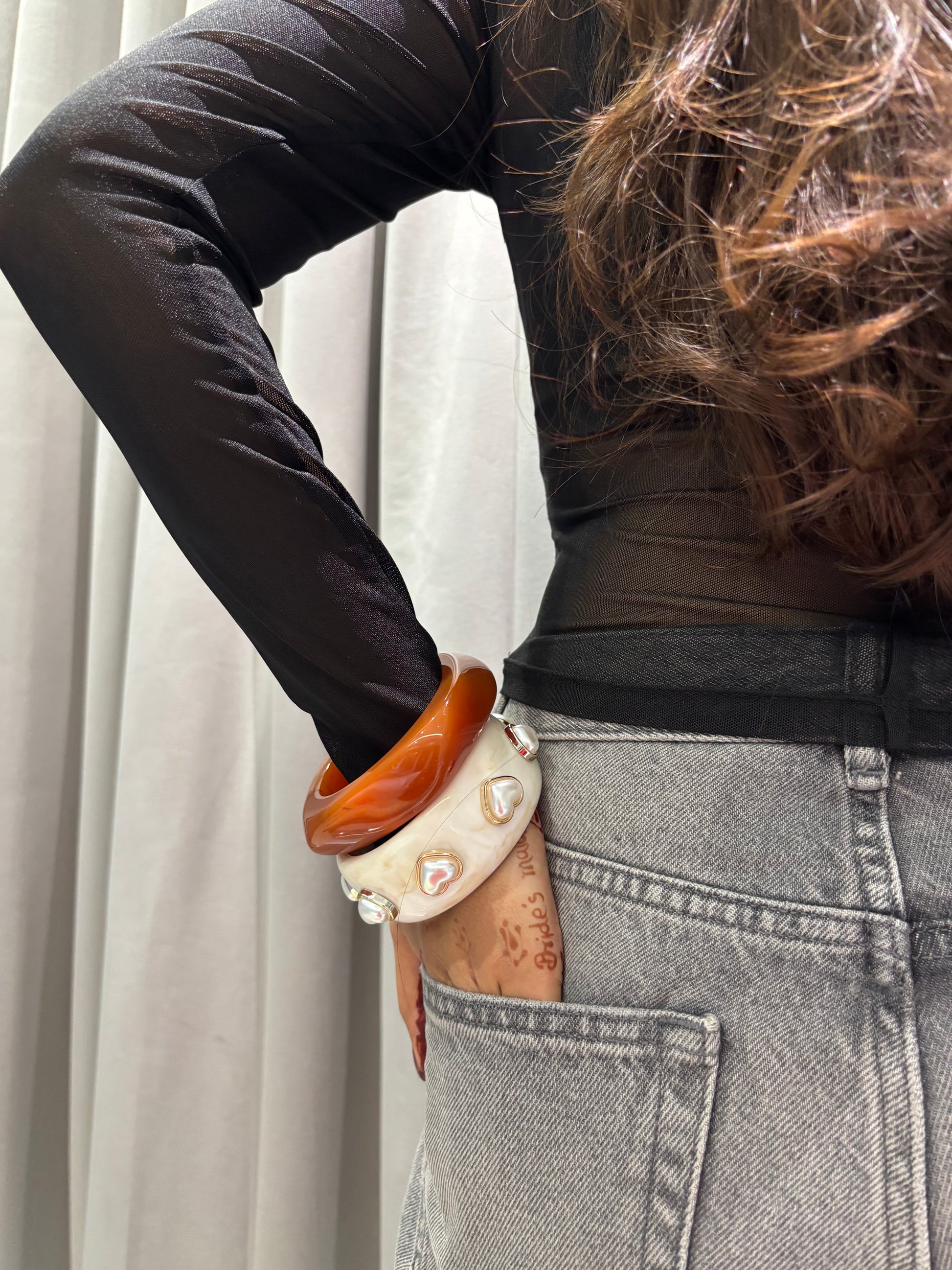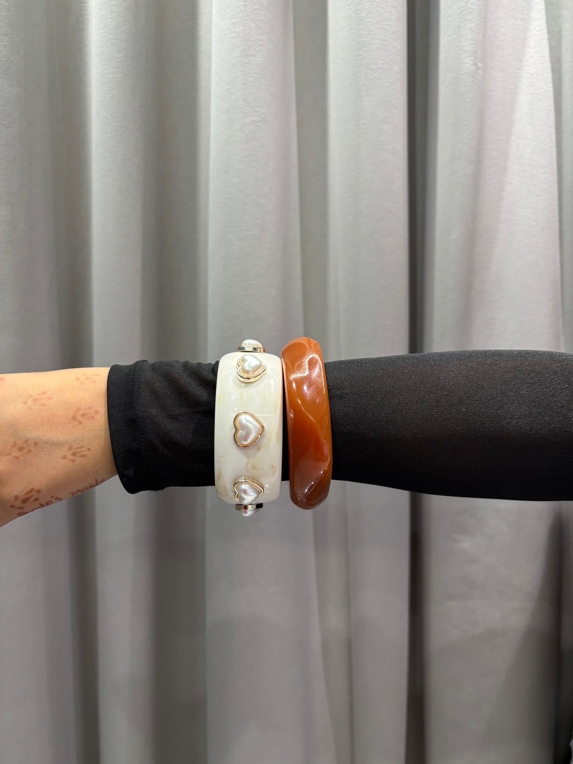 Soft, romantic, and effortlessly elegant — All Heart Stack is where classic charm meets modern style. Featuring a creamy acrylic bangle adorned with delicate heart-shaped pearl details, paired with a rich caramel-toned chunky bangle, this stack is designed to stand out while still feeling timeless.