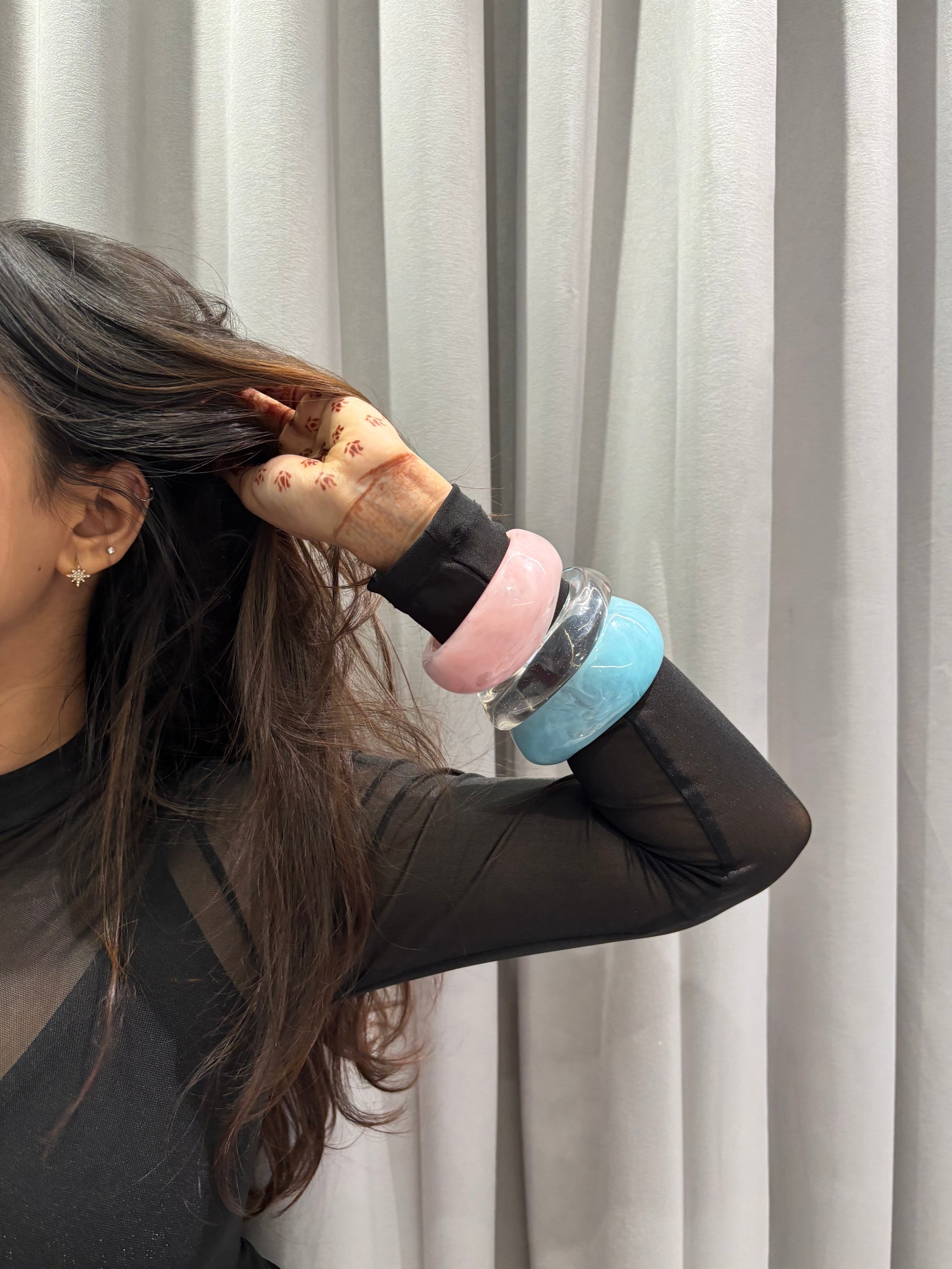 Playful, fresh, and undeniably cool — Bubblegum Stack is made for statement lovers. This stack features three chunky acrylic bangles in soothing pastel hues, creating a soft yet bold look that instantly elevates your outfit.